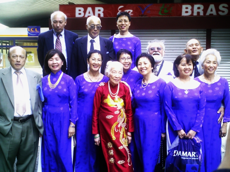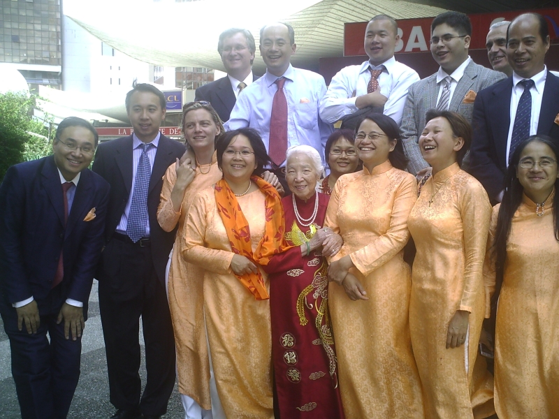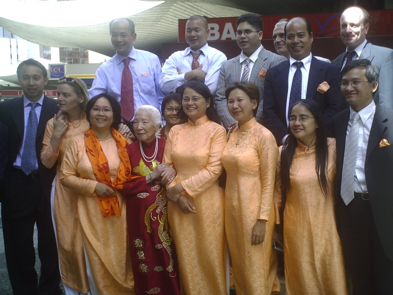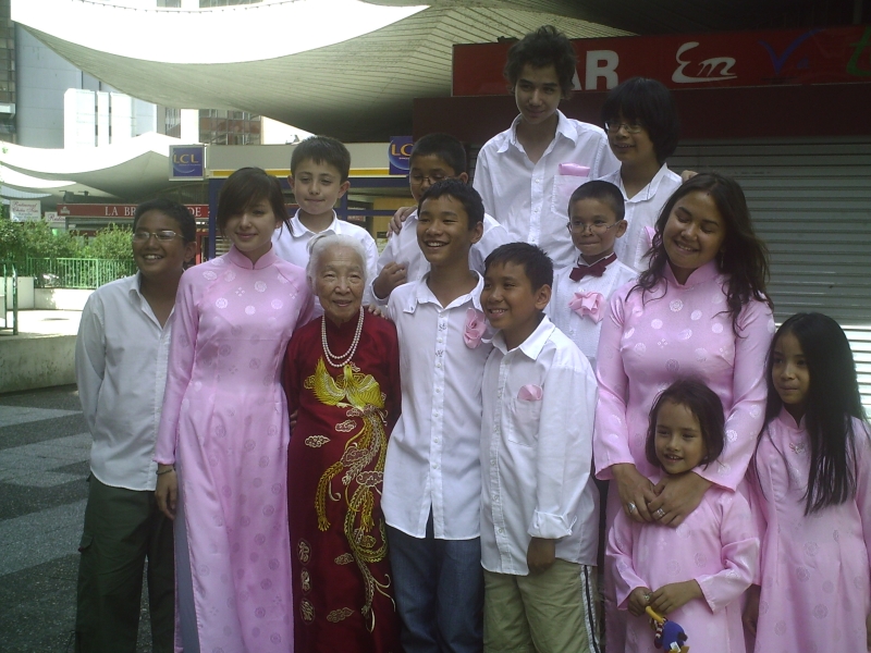 Avant-hier, samedi 21, nous étions invité à l'anniversaire de l'année !!! C'est la tante de Mama du côté Ông Ngoai qui a fêté ces 90 printemps !!! Pour dire exactement, elle est la fille de la soeur de Bà Co Nôi… . Vous suivez ?! C'était SUPER !!! Très bien organisé, avec plus de 180 invités (venant de partout…. Etats Unis, Canada …) avec de la musique pour danser le Cha-Cha-Cha et le Twist, comme Mama l'aime, beaucoup à manger : miam, miam : de l'hors d'oeuvres au dessert ! Un quiz très rigolo, par exemple : quel fils est le plus beau ? Grande tante a trois fils et quatre filles…, euh, on trouve tous les trois mô…, euh beaux. Des souvenirs, par exemple : comment la grande tante a rencontré son mari… apparemment, en lisant le journal devant elle, il a fait deux trous pour mieux l'observer… . Ah, là, là, là, ces hommes ! On s'est beaucoup amusé ! Mais voyez vous -même !