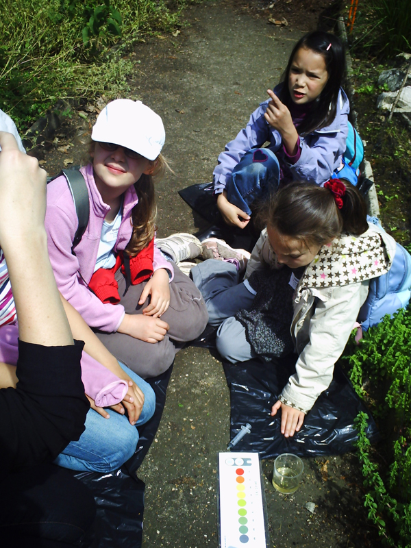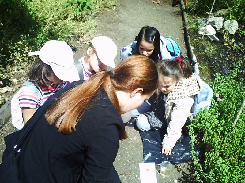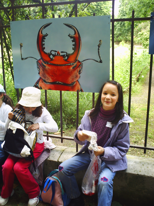 Ensuite, on est allé au Jardin écologique, spécialement ouvert pour nous ! Là, chaque groupe a reçu deux feuilles à remplir : il fallait observer une marre (des jardiniers l'ont reconstruite), un aquarium, où vivaient pleins d'insectes aquatiques et faire une expérience avec l'animatrice pour contrôler, si l'eau de la marre était acide. C'était très intéressant. Puis on n'avait trop faim. Nos petits têtes ne voulaient plus suivre tous ça et là seul chose qui nous intéressait c'était "Quand est-ce qu'on mange ?????"