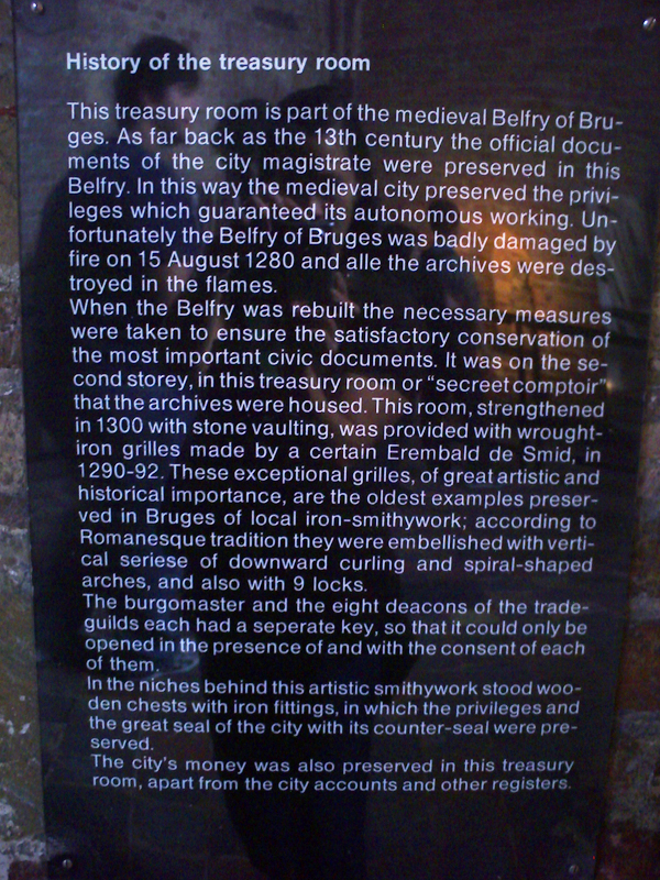 Très belle vue sur Bruges d'ici haut! On entend les cariolles … très joli, comme dans le film "Bienvenue chez les Ch'tis" :-). Un monsieur qui y joue tout en haut de la tour Belfort, on l'a vu! Admirez aussi une énorme "boîte musical", on n'a jamais vu un mécanisme si grand de l'intérieur.