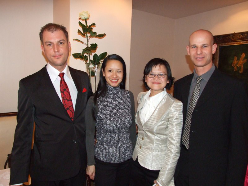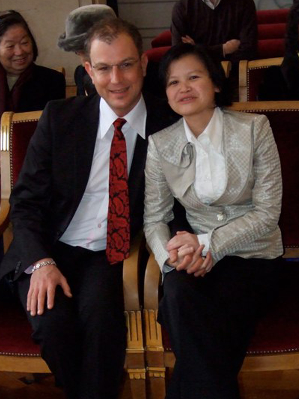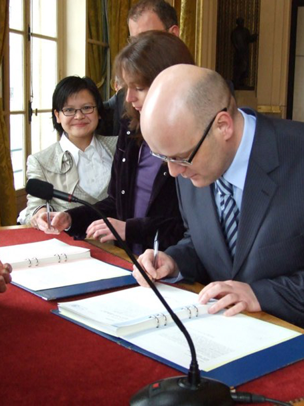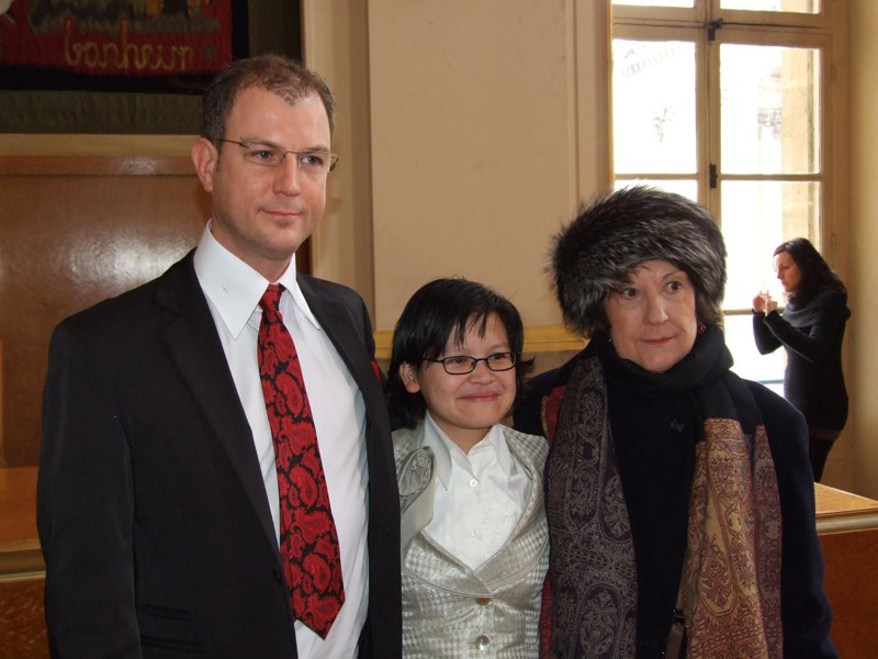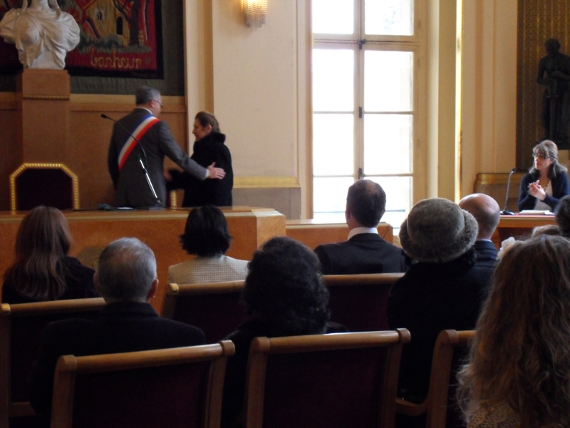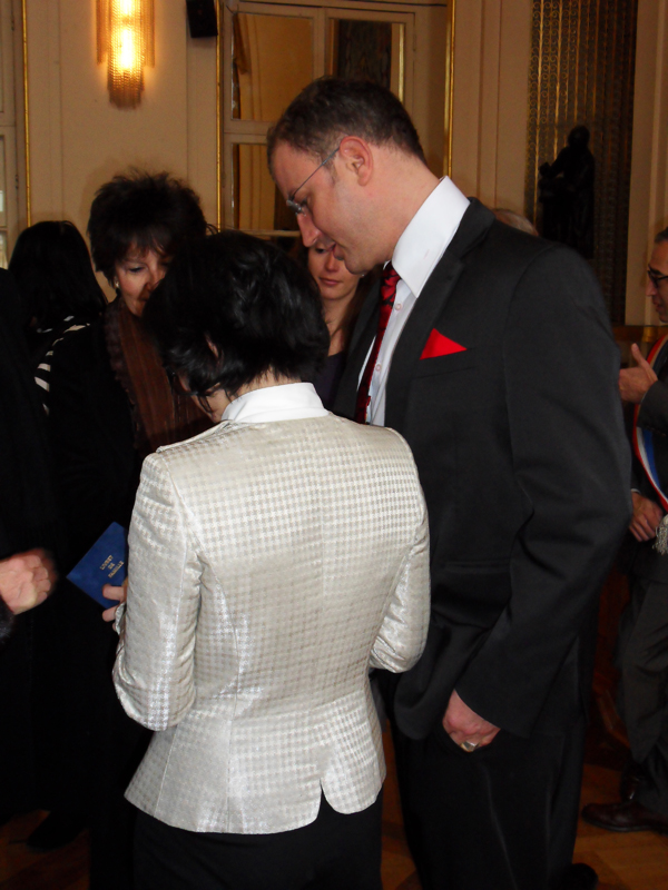 Mama qui a été à la cérémonie à la Mairie du 5ème trouvait que c'était court, simple, précis et convivial. Nous, on avait cours au collège, c'est pourquoi vous ne nous voyez pas sur les photos à la mairie, snif. Regardez, les jeunes mariés montrent leur tout nouveau livret de famille … où il y a de la place pour … 9 enfants ;-). Maintenant, il faut se dépêcher, on nous attend au restaurant "Elysées Hongkong"!
