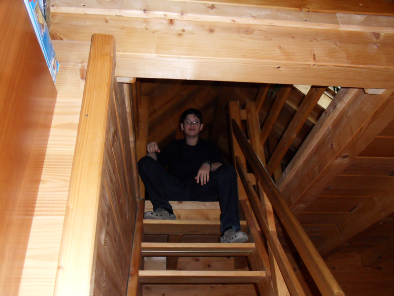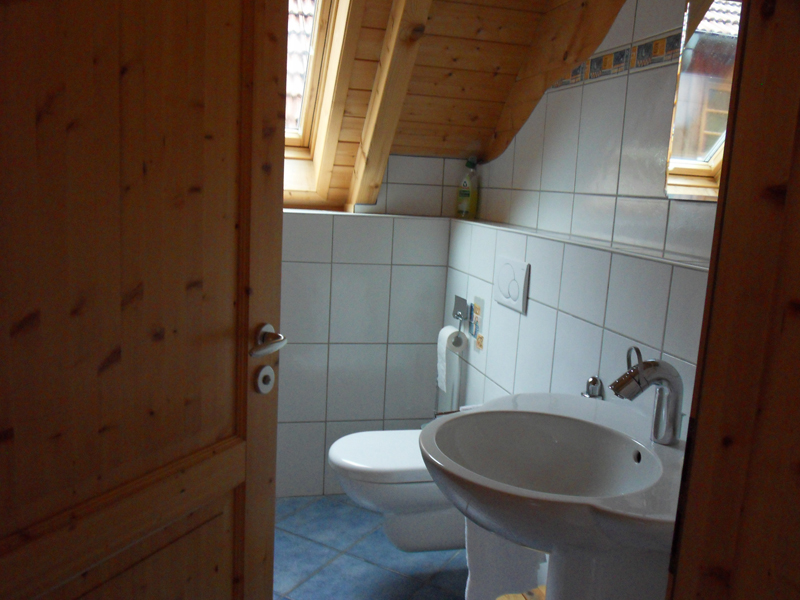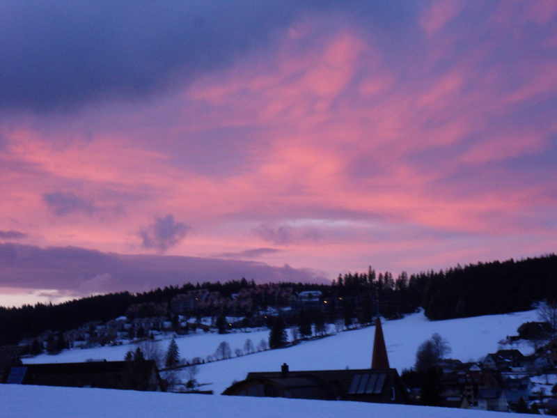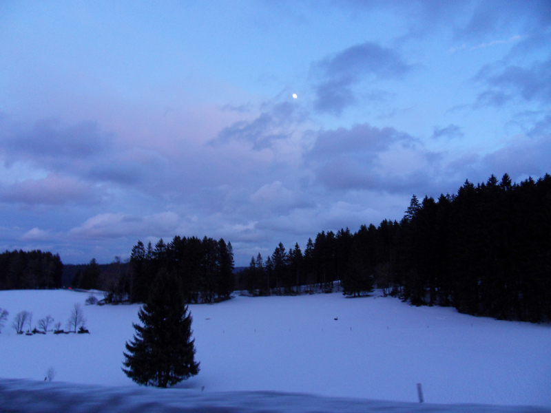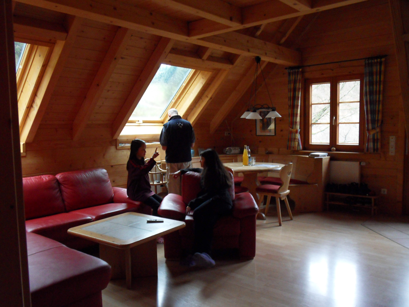 Au moins, Mama retrouve le sourire … car notre "Fewo" (Ferienwohnung = appartement de vacances en français) est magnifique! Beau, super propre, très spacieux, tout confort et super bien équipé! Et on est dans une ferme! Le "Ferienhof des Jahres 2004"! C'est à dire, cette ferme a reçu le prix de la meilleure ferme de vacances en 2004. Le "Ramsteinerhof" mérite bien sa décoration. Des vaches, poules, cochons, chats et Mara, la chienne complètent le tableau idyllique. Mais Aba ne peut toujours pas sourire … on est en vacances, l'hébergement est sublime, mais la neige nous a posé un lapin (il y en a aussi ici, dans la ferme =) ). Pas de neige … catastrophe! Mama a passé plus d'une mauvaise quart d'heure. Allez, en route pour Schonach, qui se trouve à 29 km de Fischerbach. C'est là, qu'on devrait skier. Donc, c'est là qu'il devrait y avoir de la neige. En tout cas, sur la Webcam de la piste à Schonach, Mama a VU de la neige et des gens qui skiaient.