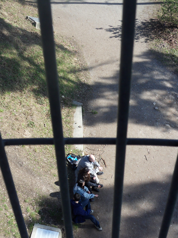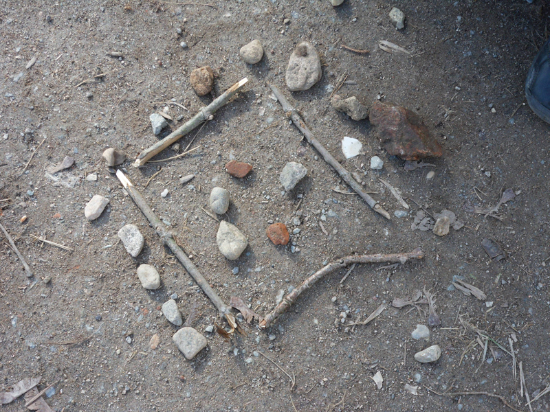 Moment de détente en bas de la tour en attendant Mama. Qui arrive à jeter les cailloux dans le cercle??!