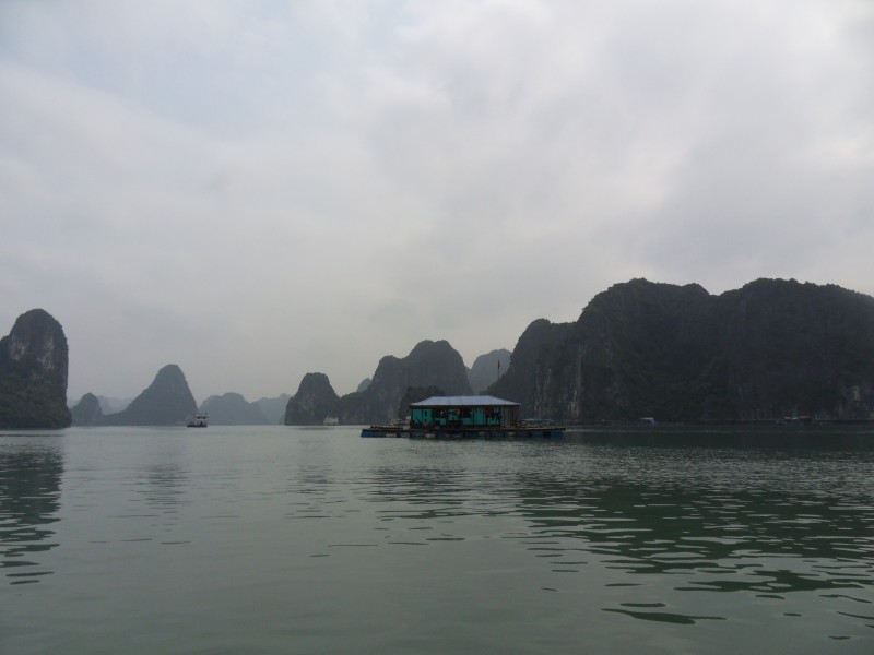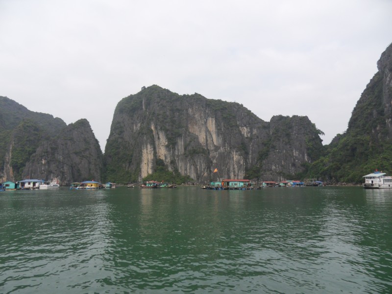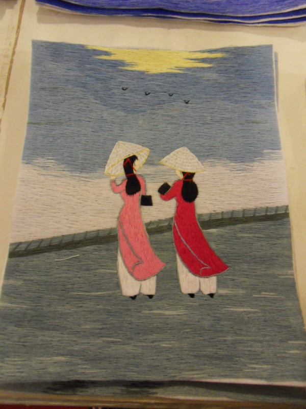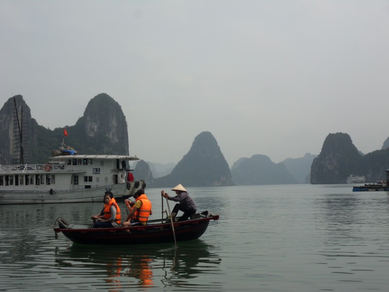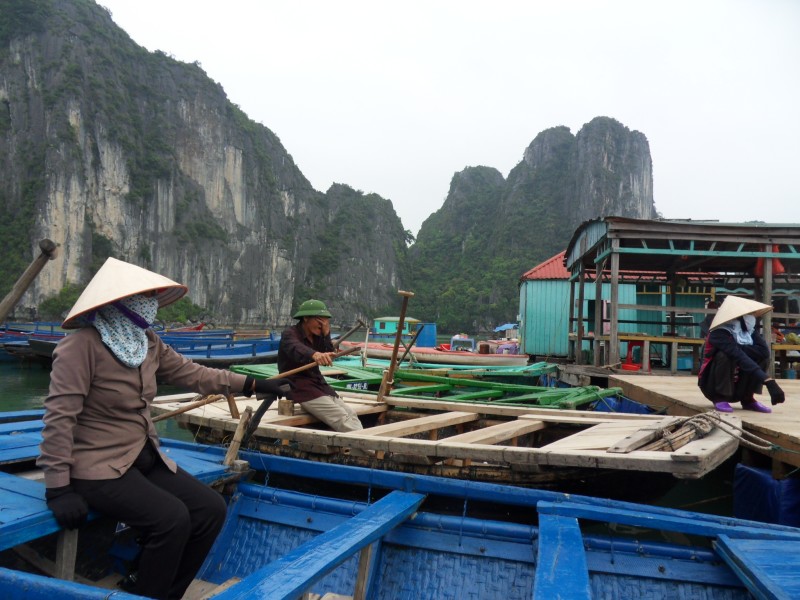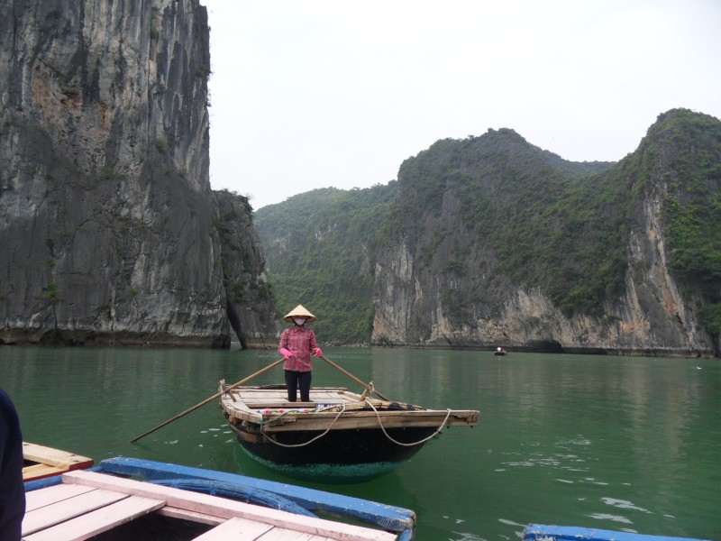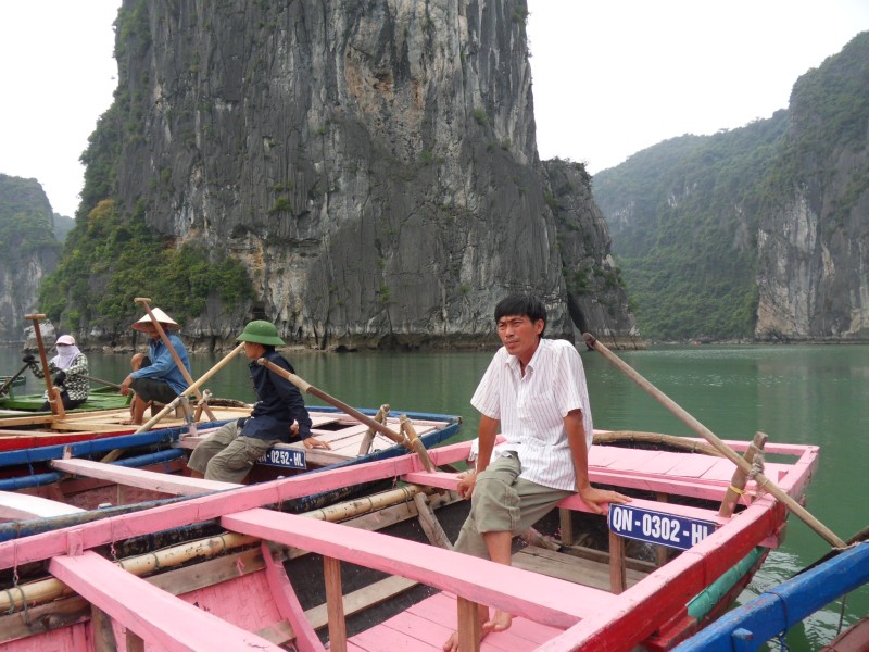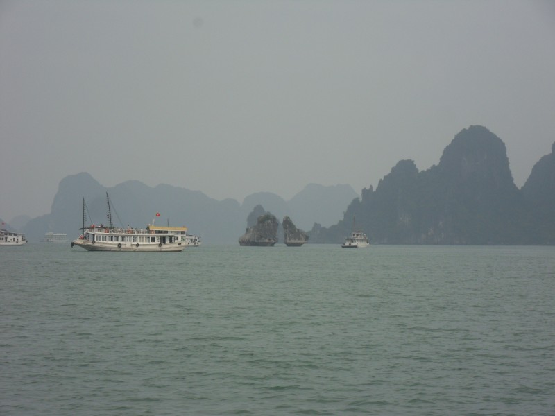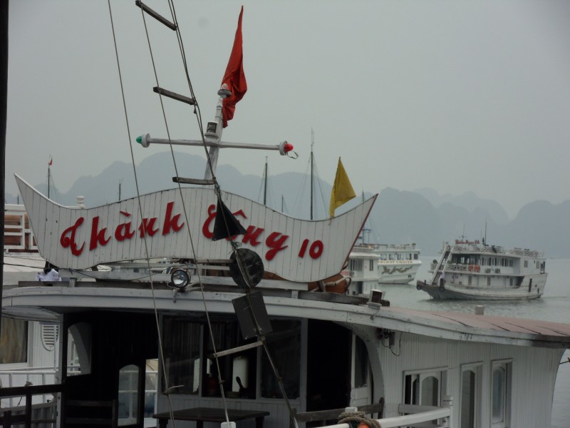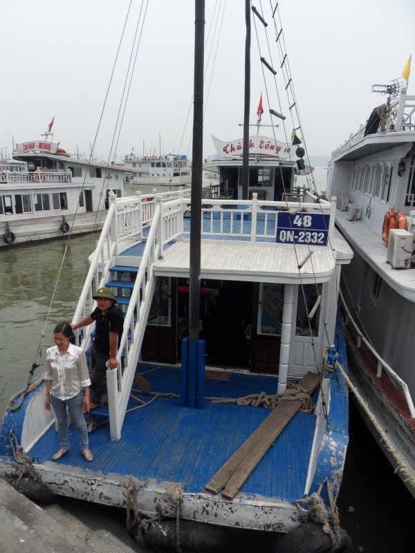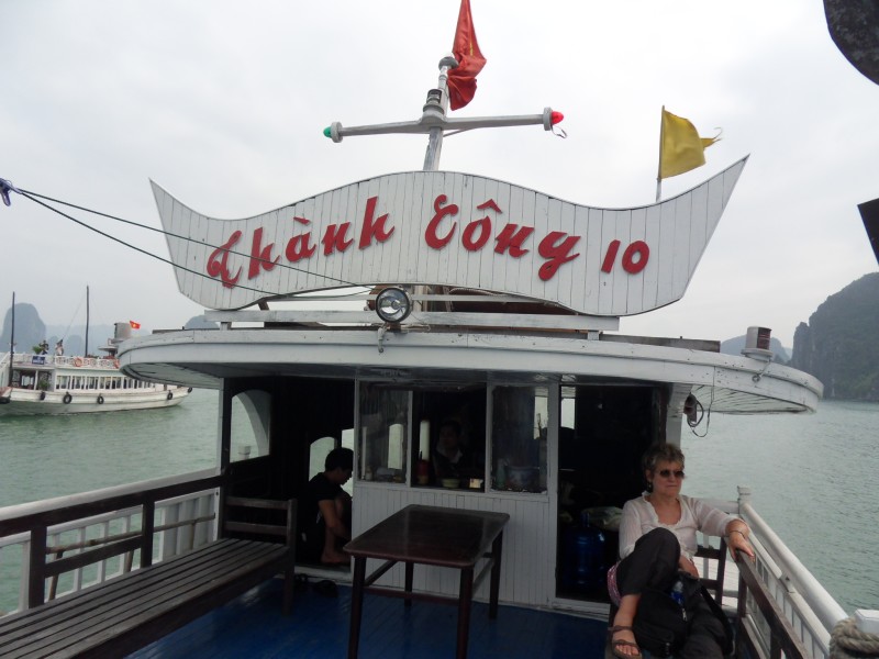 Mai-Anh et Mama se sont réveillées bien tôt ce matin … pourtant elles auraient pu dormir plus longtemps, car l’excursion qui devrait partir à 7h30 vers la Baie d’Along, est finalement partie qu’à 9h00! 😦 Les différents agences de voyage ont mal communiqué entre elles et les adresses des pick-ups ont été mal recopié. Mais bon, elles sont en vacances … alors, elles ne vont pas se lamenter ;-). Sur la route, Mai-Anh et Mama s’arrêtent à nouveau dans une usine qui emploie des ouvriers et ouvrières handicapés, cette fois-ci c’est une usine de broderie. Ce jeune homme, par exemple, qui brode cet énorme tableau d’une femme qui porte des fruits sur son épaule … est sourd-muet … mais avec un sourire radieux! Puis elles continuent leur route vers la Baie d’Along. Que dire encore sur la Baie d’Along ? … comme vous le savez, ça fait 18 ans que Mama n’est pas retournée ici … avant il y avait un ou deux voir trois bateaux par jour qui faisaient le tour de la Baie d’Along … maintenant il y en a environ 600 en tout. Faites le calcul … c’est très touristique par ici, hallucinant. Mais ça fait vivre la communauté … bien mieux qu’avant, donc c’est bien :-). Dommage, que le ciel n’est pas bleu. Mais c’est quand même très beau ici … et le repas sur le bateau … exquis ;-). Bon appétit!