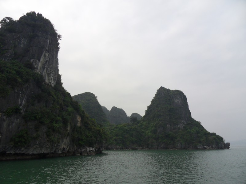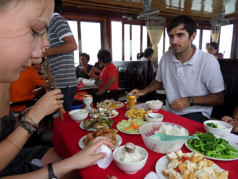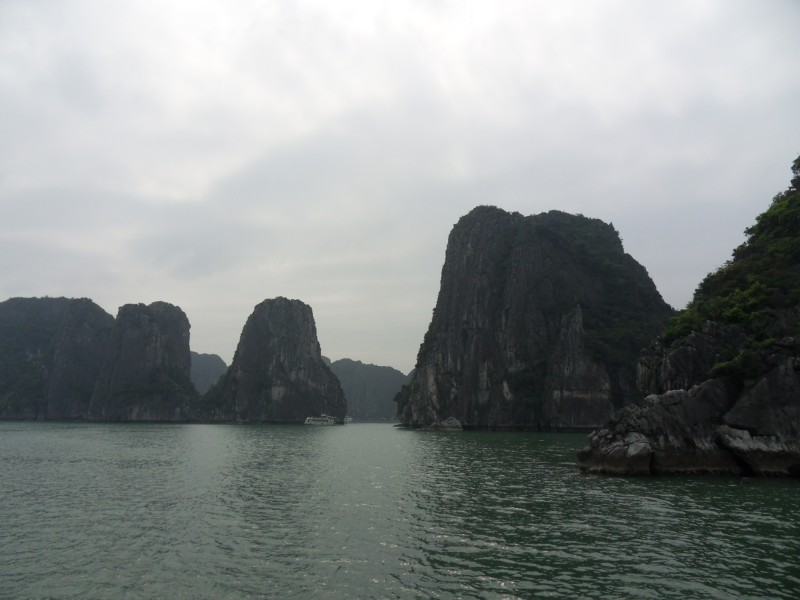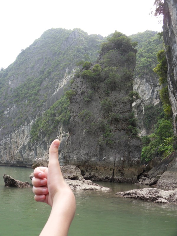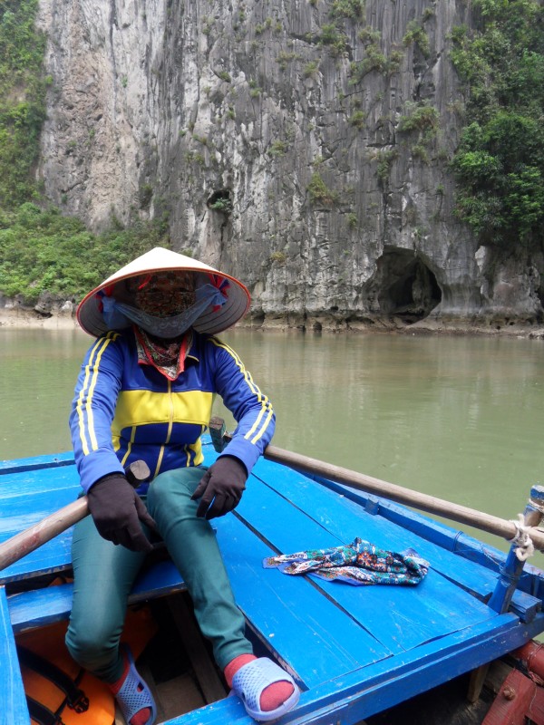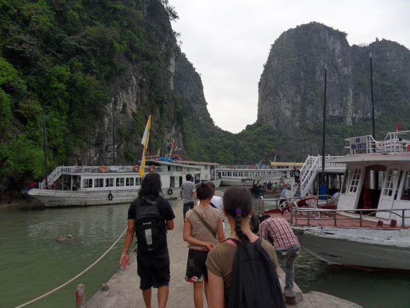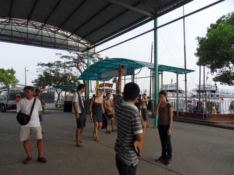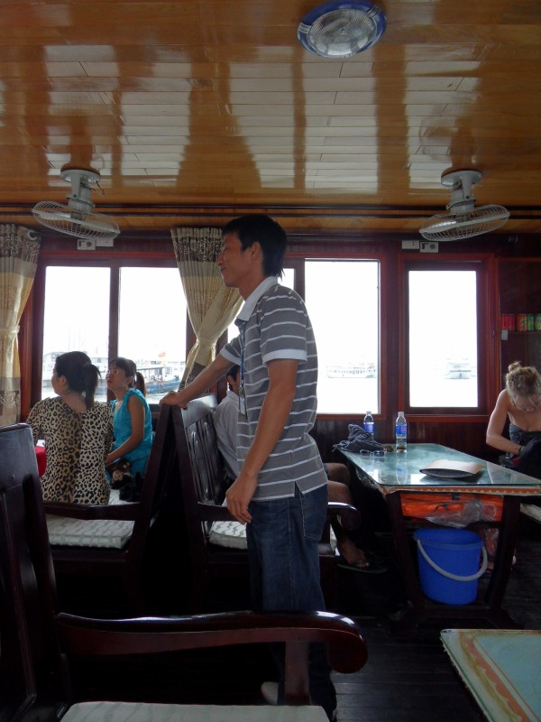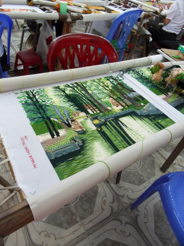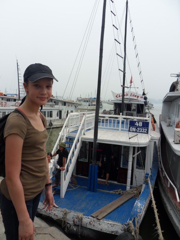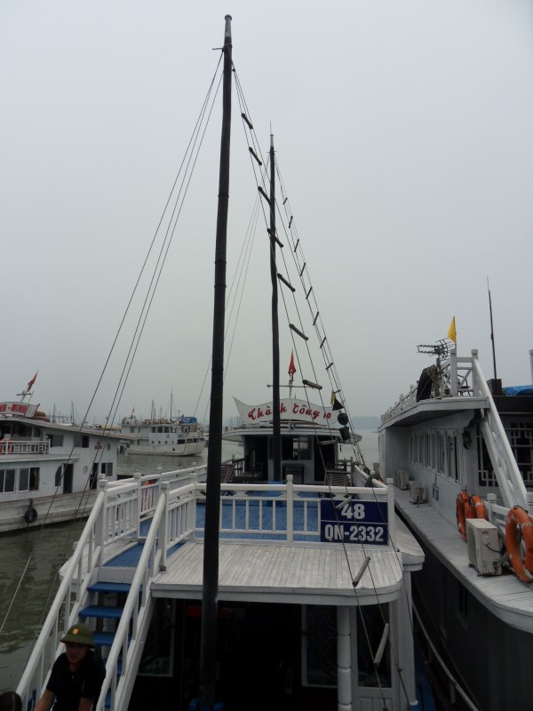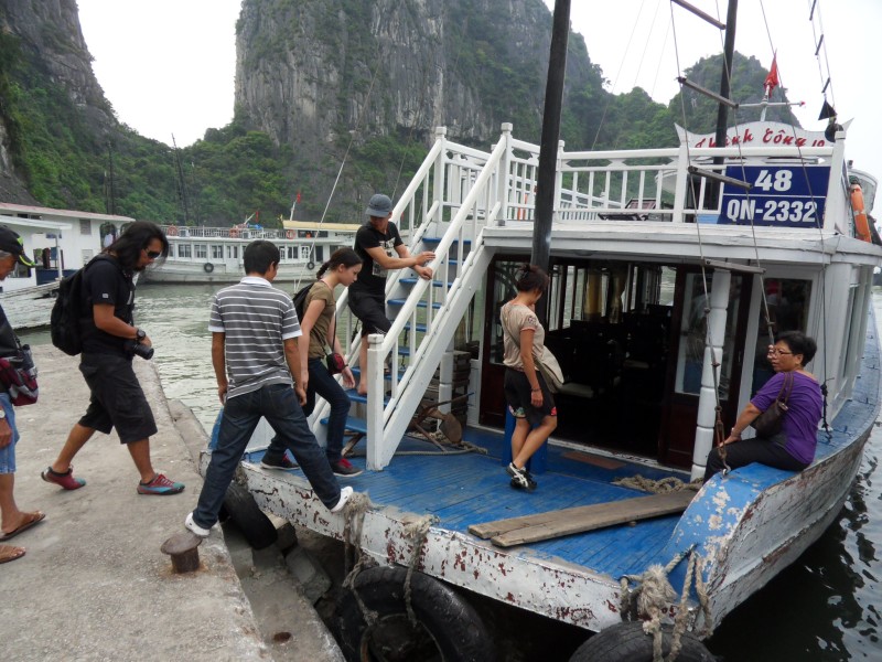 Mai-Anh et Mama se sont réveillées bien tôt ce matin … pourtant elles auraient pu dormir plus longtemps, car l’excursion qui devrait partir à 7h30 vers la Baie d’Along, est finalement partie qu’à 9h00! 😦 Les différents agences de voyage ont mal communiqué entre elles et les adresses des pick-ups ont été mal recopié. Mais bon, elles sont en vacances … alors, elles ne vont pas se lamenter ;-). Sur la route, Mai-Anh et Mama s’arrêtent à nouveau dans une usine qui emploie des ouvriers et ouvrières handicapés, cette fois-ci c’est une usine de broderie. Ce jeune homme, par exemple, qui brode cet énorme tableau d’une femme qui porte des fruits sur son épaule … est sourd-muet … mais avec un sourire radieux! Puis elles continuent leur route vers la Baie d’Along. Que dire encore sur la Baie d’Along ? … comme vous le savez, ça fait 18 ans que Mama n’est pas retournée ici … avant il y avait un ou deux voir trois bateaux par jour qui faisaient le tour de la Baie d’Along … maintenant il y en a environ 600 en tout. Faites le calcul … c’est très touristique par ici, hallucinant. Mais ça fait vivre la communauté … bien mieux qu’avant, donc c’est bien :-). Dommage, que le ciel n’est pas bleu. Mais c’est quand même très beau ici … et le repas sur le bateau … exquis ;-). Bon appétit!