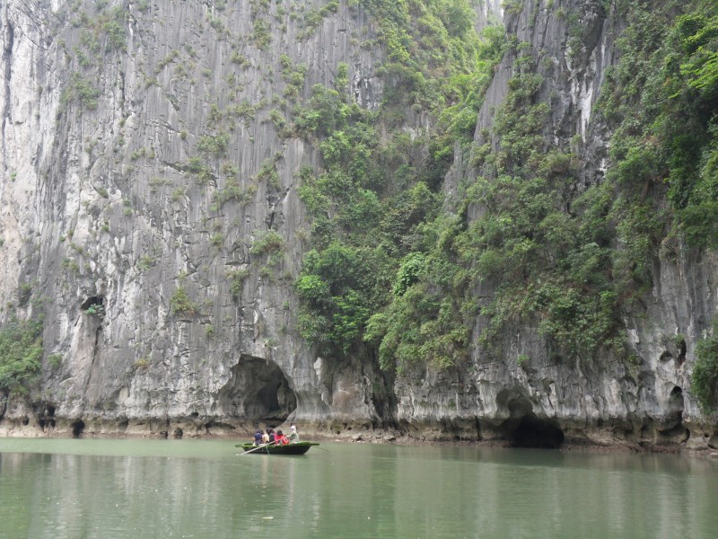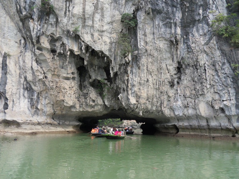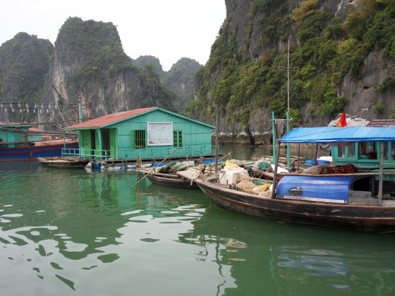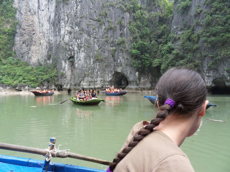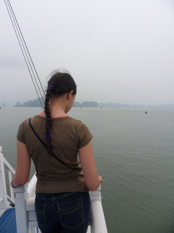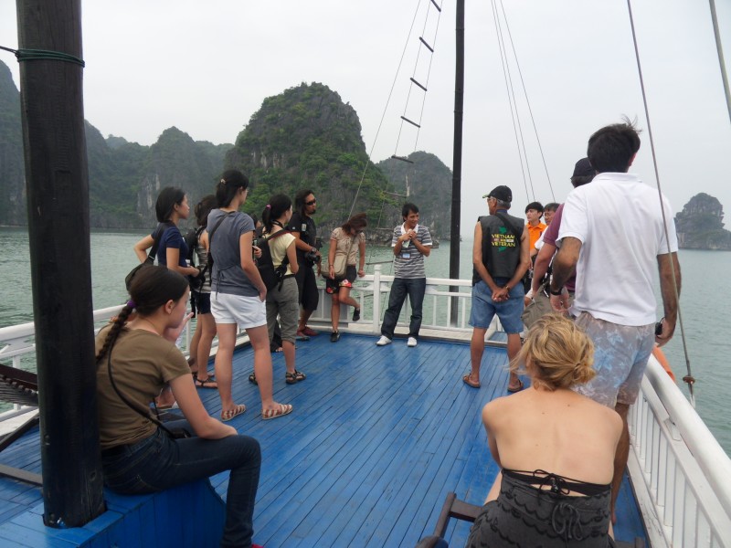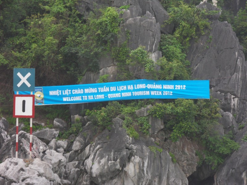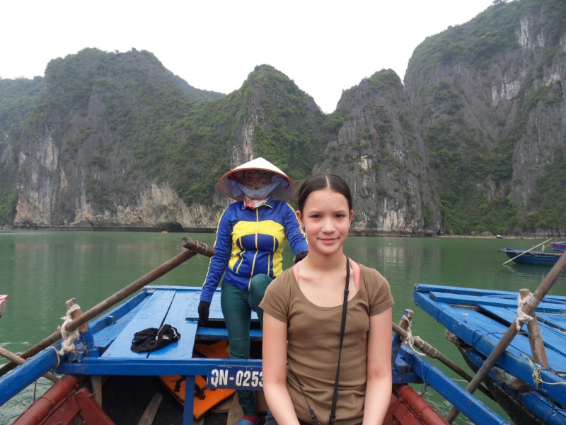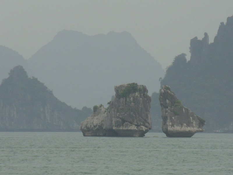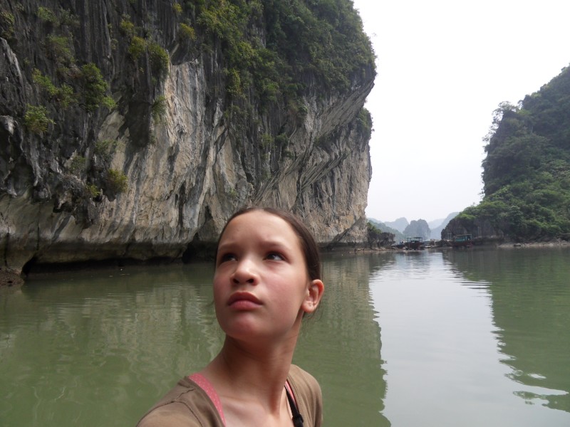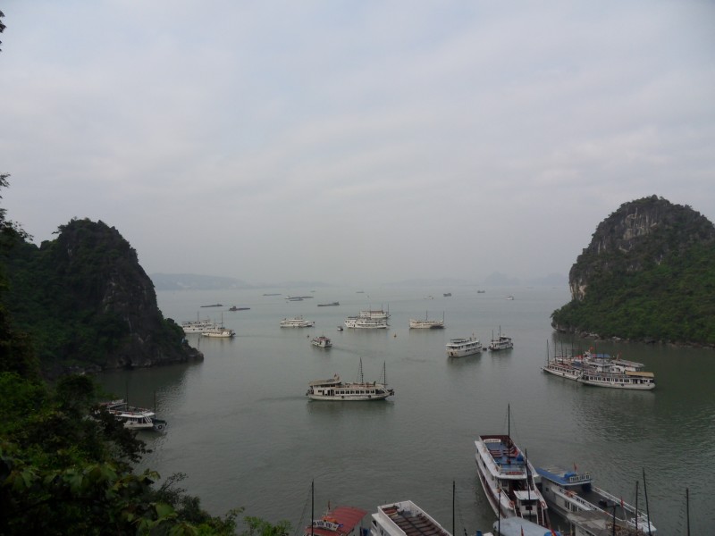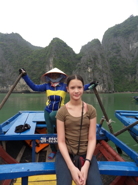 Mai-Anh et Mama se sont réveillées bien tôt ce matin … pourtant elles auraient pu dormir plus longtemps, car l’excursion qui devrait partir à 7h30 vers la Baie d’Along, est finalement partie qu’à 9h00! 😦 Les différents agences de voyage ont mal communiqué entre elles et les adresses des pick-ups ont été mal recopié. Mais bon, elles sont en vacances … alors, elles ne vont pas se lamenter ;-). Sur la route, Mai-Anh et Mama s’arrêtent à nouveau dans une usine qui emploie des ouvriers et ouvrières handicapés, cette fois-ci c’est une usine de broderie. Ce jeune homme, par exemple, qui brode cet énorme tableau d’une femme qui porte des fruits sur son épaule … est sourd-muet … mais avec un sourire radieux! Puis elles continuent leur route vers la Baie d’Along. Que dire encore sur la Baie d’Along ? … comme vous le savez, ça fait 18 ans que Mama n’est pas retournée ici … avant il y avait un ou deux voir trois bateaux par jour qui faisaient le tour de la Baie d’Along … maintenant il y en a environ 600 en tout. Faites le calcul … c’est très touristique par ici, hallucinant. Mais ça fait vivre la communauté … bien mieux qu’avant, donc c’est bien :-). Dommage, que le ciel n’est pas bleu. Mais c’est quand même très beau ici … et le repas sur le bateau … exquis ;-). Bon appétit!