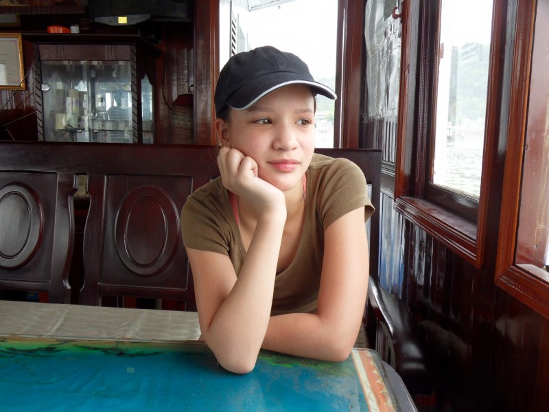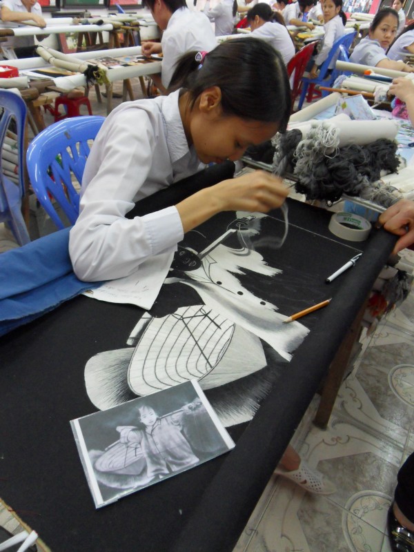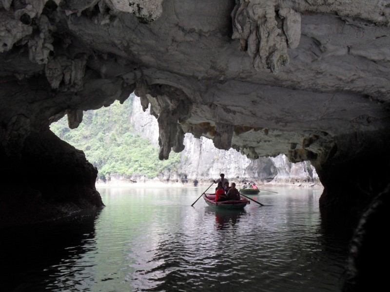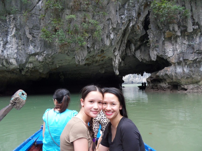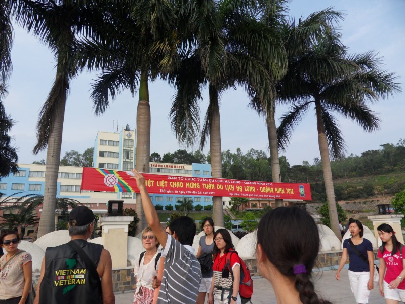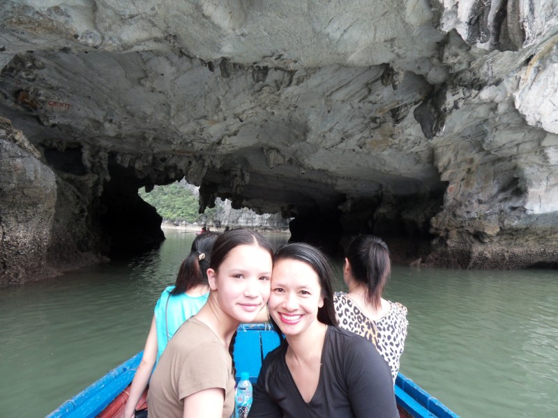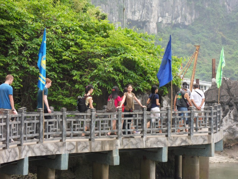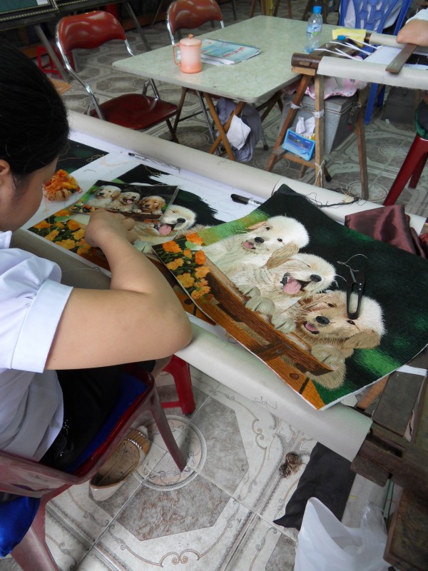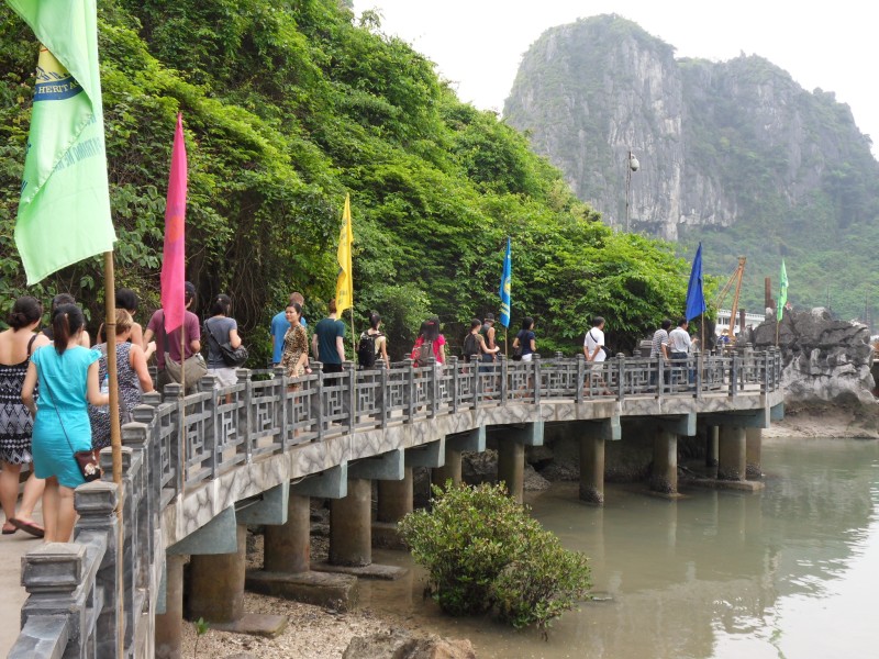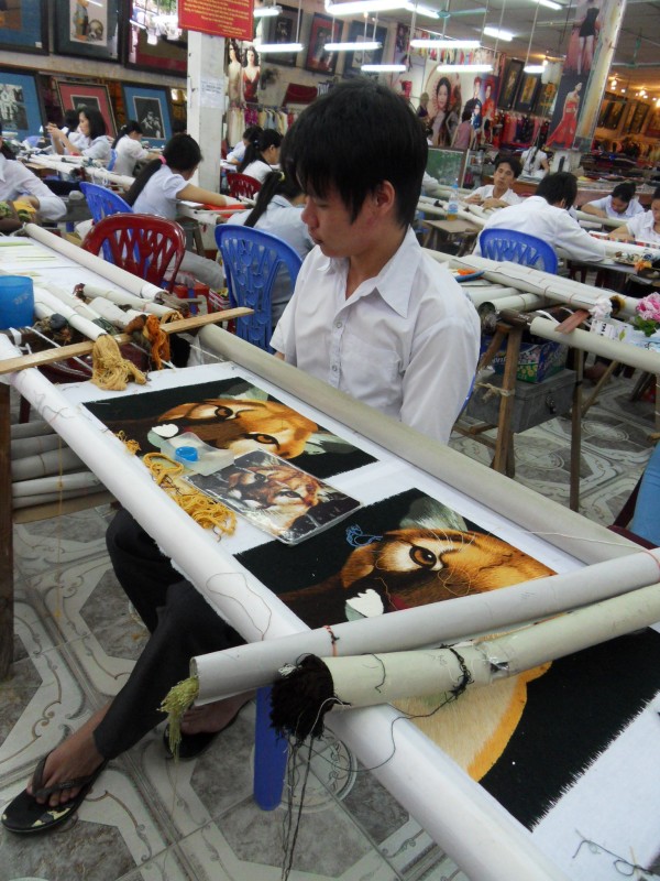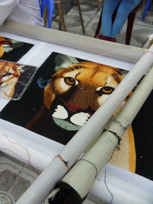 Mai-Anh et Mama se sont réveillées bien tôt ce matin … pourtant elles auraient pu dormir plus longtemps, car l’excursion qui devrait partir à 7h30 vers la Baie d’Along, est finalement partie qu’à 9h00! 😦 Les différents agences de voyage ont mal communiqué entre elles et les adresses des pick-ups ont été mal recopié. Mais bon, elles sont en vacances … alors, elles ne vont pas se lamenter ;-). Sur la route, Mai-Anh et Mama s’arrêtent à nouveau dans une usine qui emploie des ouvriers et ouvrières handicapés, cette fois-ci c’est une usine de broderie. Ce jeune homme, par exemple, qui brode cet énorme tableau d’une femme qui porte des fruits sur son épaule … est sourd-muet … mais avec un sourire radieux! Puis elles continuent leur route vers la Baie d’Along. Que dire encore sur la Baie d’Along ? … comme vous le savez, ça fait 18 ans que Mama n’est pas retournée ici … avant il y avait un ou deux voir trois bateaux par jour qui faisaient le tour de la Baie d’Along … maintenant il y en a environ 600 en tout. Faites le calcul … c’est très touristique par ici, hallucinant. Mais ça fait vivre la communauté … bien mieux qu’avant, donc c’est bien :-). Dommage, que le ciel n’est pas bleu. Mais c’est quand même très beau ici … et le repas sur le bateau … exquis ;-). Bon appétit!
