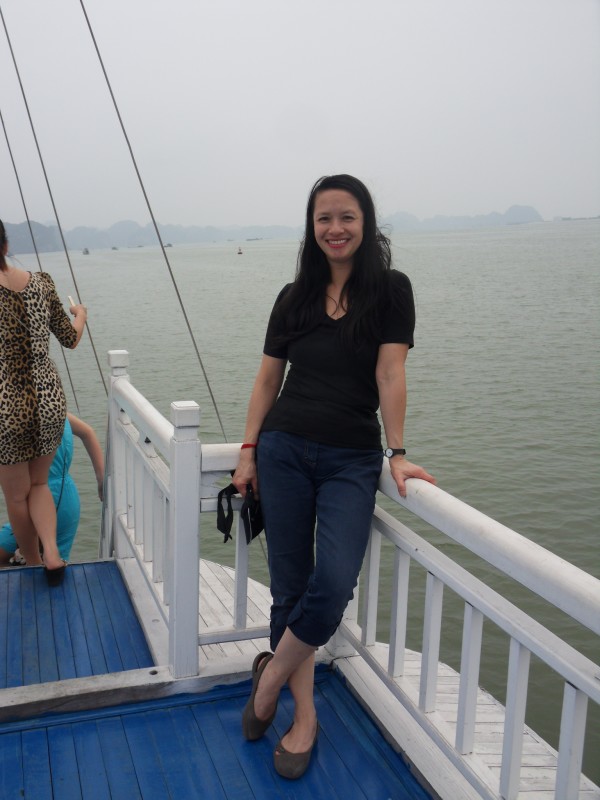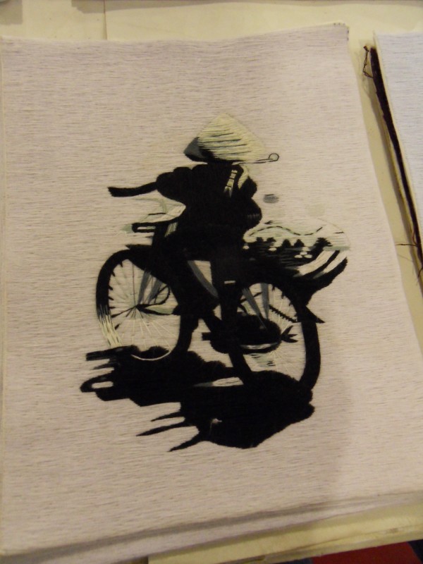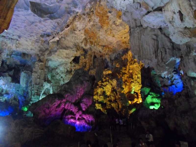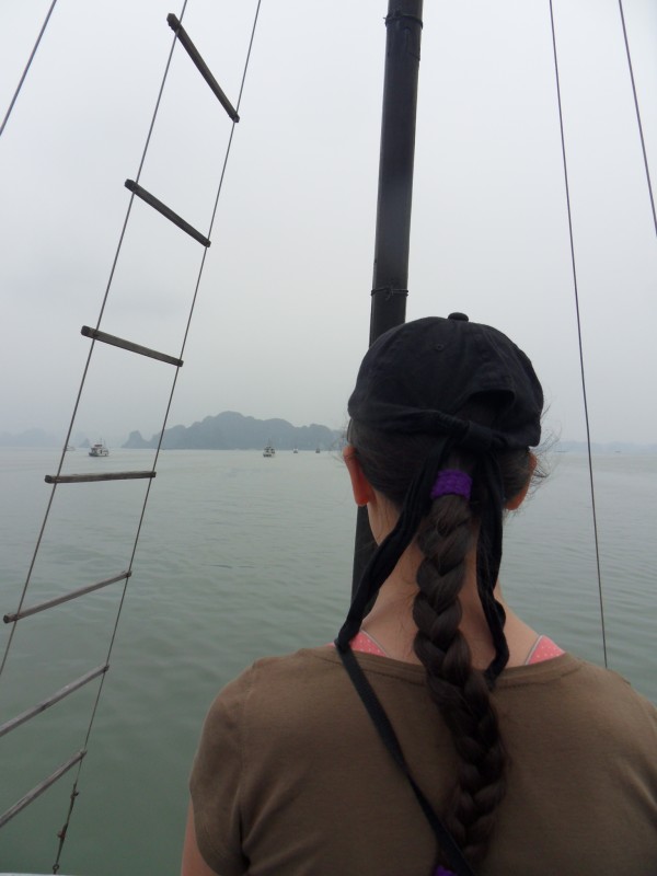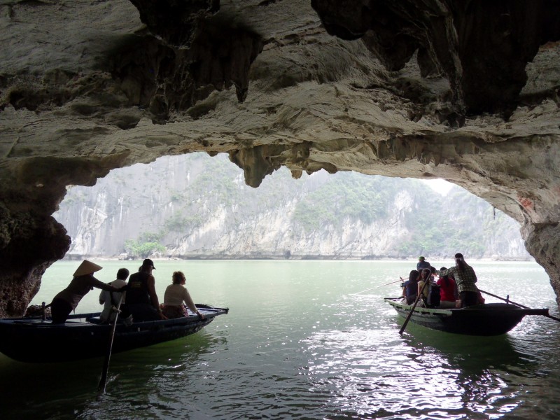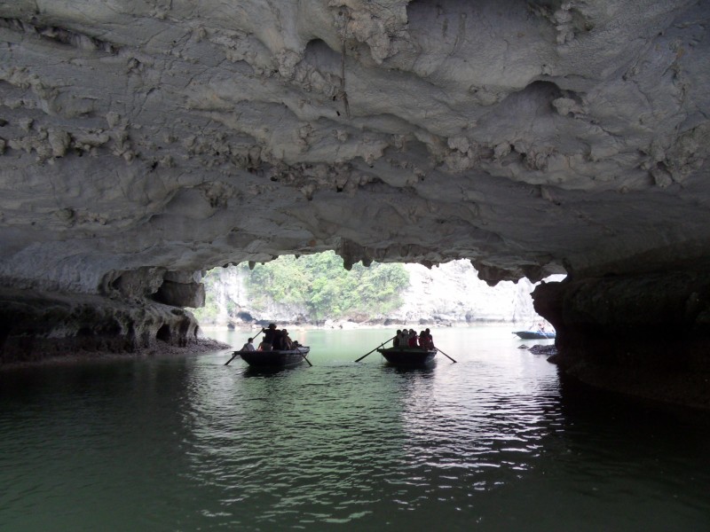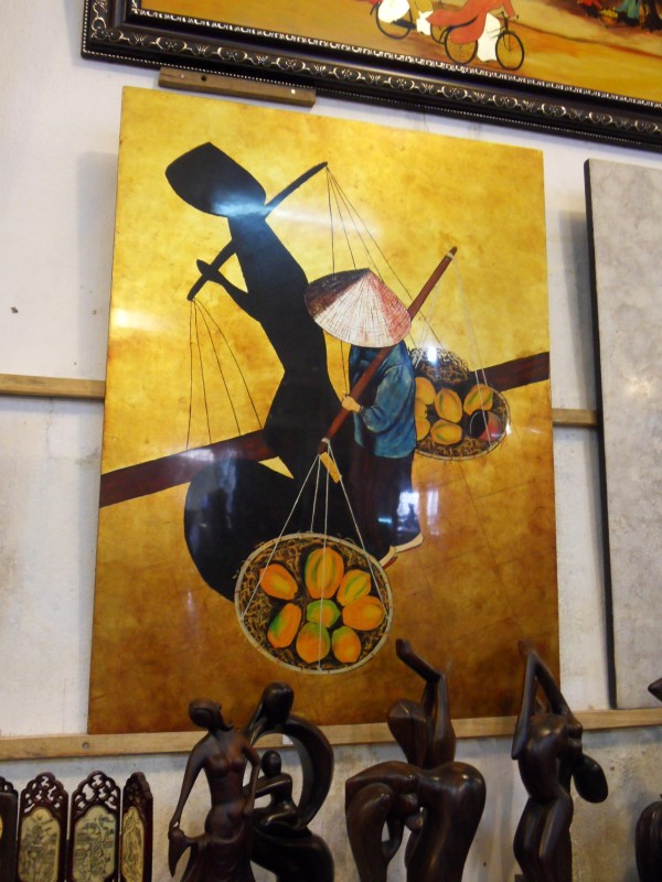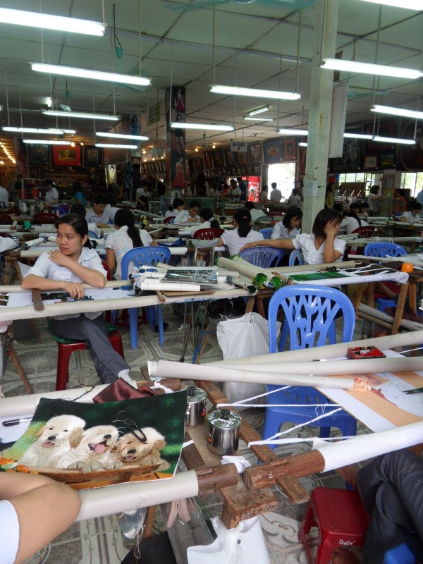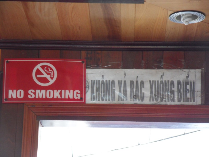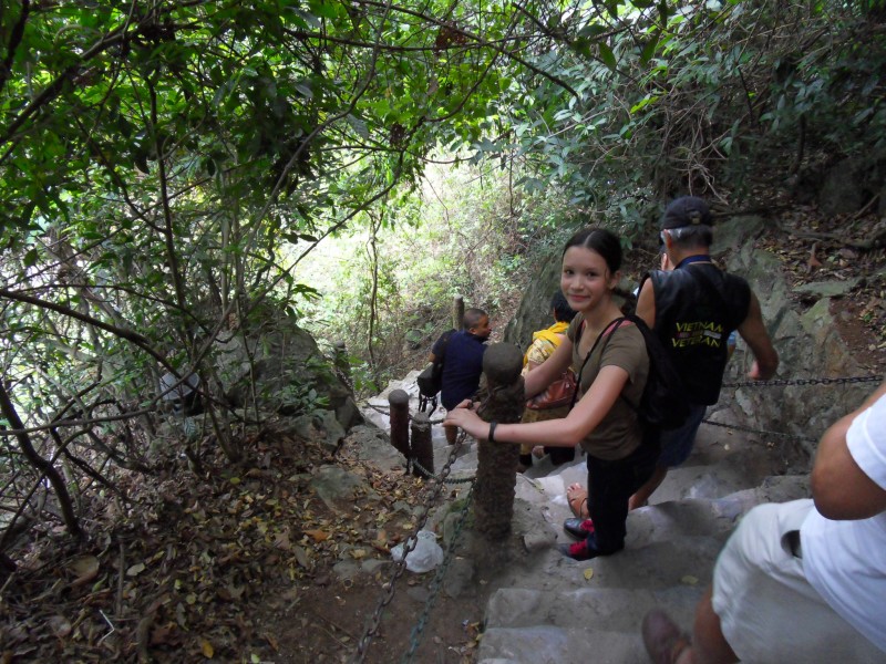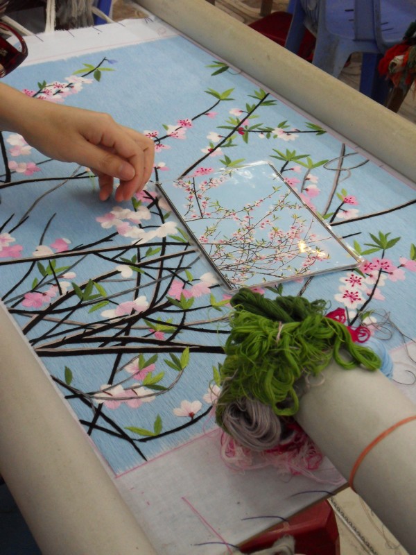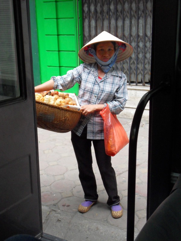 Mai-Anh et Mama se sont réveillées bien tôt ce matin … pourtant elles auraient pu dormir plus longtemps, car l’excursion qui devrait partir à 7h30 vers la Baie d’Along, est finalement partie qu’à 9h00! 😦 Les différents agences de voyage ont mal communiqué entre elles et les adresses des pick-ups ont été mal recopié. Mais bon, elles sont en vacances … alors, elles ne vont pas se lamenter ;-). Sur la route, Mai-Anh et Mama s’arrêtent à nouveau dans une usine qui emploie des ouvriers et ouvrières handicapés, cette fois-ci c’est une usine de broderie. Ce jeune homme, par exemple, qui brode cet énorme tableau d’une femme qui porte des fruits sur son épaule … est sourd-muet … mais avec un sourire radieux! Puis elles continuent leur route vers la Baie d’Along. Que dire encore sur la Baie d’Along ? … comme vous le savez, ça fait 18 ans que Mama n’est pas retournée ici … avant il y avait un ou deux voir trois bateaux par jour qui faisaient le tour de la Baie d’Along … maintenant il y en a environ 600 en tout. Faites le calcul … c’est très touristique par ici, hallucinant. Mais ça fait vivre la communauté … bien mieux qu’avant, donc c’est bien :-). Dommage, que le ciel n’est pas bleu. Mais c’est quand même très beau ici … et le repas sur le bateau … exquis ;-). Bon appétit!